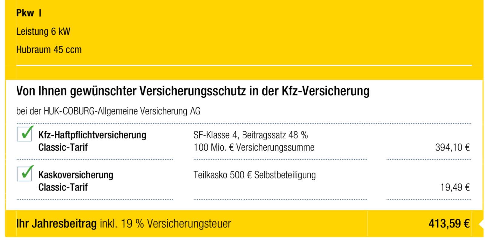 Haftpflicht ab 125 € Super-Preis-Leistung. Teilkasko ja. Vollkasko nein.
